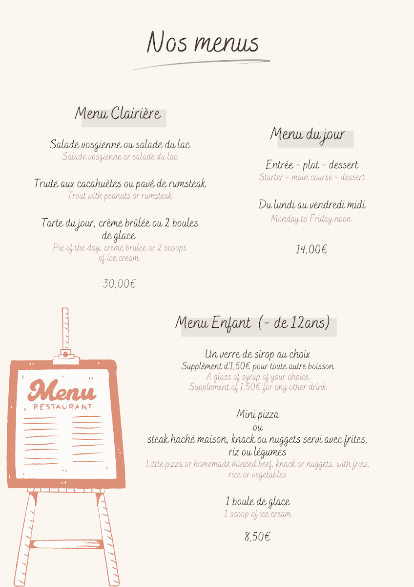 Nestled in the serene surroundings of Xonrupt-Longemer, La Clairiere offers a delightful dining experience that captivates the senses. Known for its child-friendly atmosphere and inviting interior, this eatery excels in delivering fresh, quality dishes. The menu features a varied selection, from delectable pizzas to comforting espressos, making it an ideal spot whether you're seeking a leisurely meal or a warm drink on a chilly day.